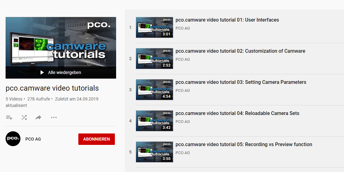 Camware Video Tutorials Unter folgendem Link finden Sie hilfreiche Video-Anleitungen zum Umgang mit unserer pco.camware. - User Interfaces - Customization of Camware - Setting Camera Parameters - Reloadable Camera Sets - Recording vs Preview Function ... https://www.youtube.com/playlist?list=PLLzNEOEdVQOpjZ8y48oVdsCt9TN04xck4 Veröffentlicht 19.06.2020 10:25